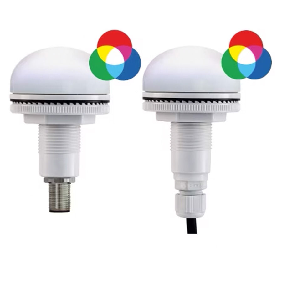 El modelo PM22L RGB es un LED de montaje en panel multicolor y constante que ofrece siete opciones de color dentro de la misma unidad. Está disponible en 24VDC y tiene dos opciones de conexión eléctrica: prensaestopas M12 con cables de 12" (300 mm) o conexión rápida M12 de 4 pines (modelos -Q).